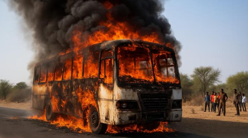 जैसलमेर में चलती निजी बस में भीषण आग, कई यात्री झुलसे।