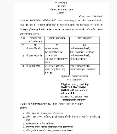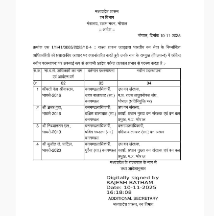 MP में प्रशासनिक हलचल: 4 IFS और 3 राज्य वन अधिकारी पदों से बदले गए