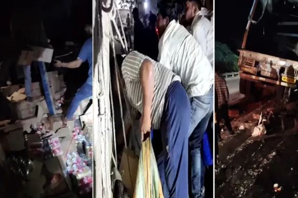 ट्राला दुर्घटनाग्रस्त होते ही शराब की लूट, रोकने गई पुलिस टीम पर बरसे पत्थर