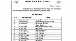 जयपुर|राजस्थान में संगठन को और मजबूत बनाने के लिए भारतीय जनता पार्टी (BJP) ने प्रदेश कार्यसमिति की नई सूची जारी की है। इस कार्यसमिति में कई वरिष्ठ नेताओं को स्थायी आमंत्रित सदस्य बनाया गया है और सभी जिलों को प्रतिनिधित्व देने पर विशेष ध्यान रखा गया है। नई सूची में मुख्यमंत्री भजनलाल शर्मा, पूर्व मुख्यमंत्री वसुंधरा राजे, अशोक परनामी, अरुण चतुर्वेदी, सतीश पूनियां, सीपी जोशी, गजेंद्र सिंह शेखावत, भूपेंद्र यादव, अर्जुन मेघवाल, भागीरथ चौधरी, रवनीत सिंह बिट्टू और राजेंद्र राठौड़ को स्थायी आमंत्रित सदस्य के रूप में शामिल किया गया है।इसके अलावा जयपुर शहर से सुमन शर्मा, सुनील कोठारी, रणजीत सोडाला और ज्योति खंडेलवाल को कार्यसमिति में जगह मिली है। जयपुर दक्षिण से प्रोमिला कुंडारा और जयपुर उत्तर से रत्ना कुमारी को शामिल किया गया है। बीकानेर शहर से गोपाल गहलोत और सत्यप्रकाश आचार्य को कार्यसमिति में जगह मिली है, जबकि बीकानेर देहात से कुंभाराम सिंह और जालिम सिंह भाटी को सदस्य बनाया गया है। श्रीगंगानगर से महेश पेड़ीवाल और संतोष बावरी को कार्यसमिति में शामिल किया गया है और हनुमानगढ़ से दमयंती बेनीवाल को सदस्य बनाया गया है।