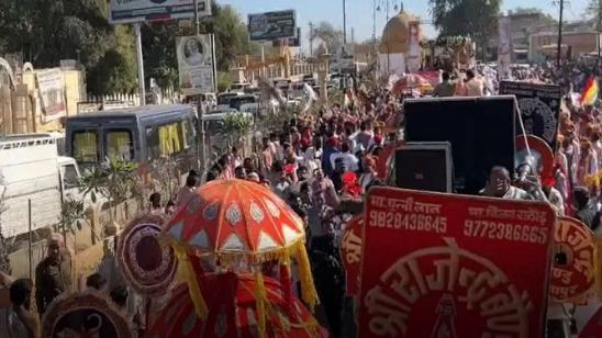 इस लेकर शनिवार को जैसलमेर के सोना किले से शोभायात्रा निकाली गई। यहां से शोभायात्रा गढ़ीसर लेकर पहुंची। इसके पूर्व महाराष्ट्र सरकार में मंत्री मंगल प्रभात लोढ़ा ने वरघोड़ा को हरी झंडी दिखाकर रवाना किया। इस दौरान ड्रोन से फूलों की बारिश की गई। सोनार किले से विंटेज कार में चादर को देदांसर ग्राउंड पर लेकर आए थे। आयोजन स्थल पर पानी के जहाज की तरह रथ बनाया गया, जिसमें चादर को दर्शन के लिए रखा गया।