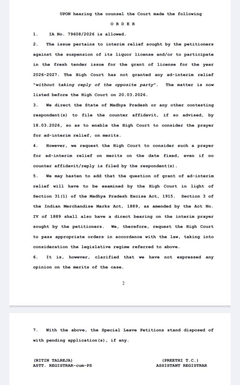 राज्य सरकार और अन्य प्रतिवादियों को 18 मार्च 2026 तक काउंटर एफिडेविट दाखिल करने का निर्देश दिया। हाई कोर्ट से कहा कि वह 20 मार्च 2026 को अंतरिम राहत पर गुण-दोष के आधार पर निर्णय ले, चाहे जवाब दाखिल हो या न हो। यह भी स्पष्ट किया कि सुप्रीम कोर्ट ने मामले के मेरिट पर कोई राय नहीं दी है। किन कानूनों पर रहेगा फोकस सुप्रीम कोर्ट ने हाई कोर्ट को निर्देश दिया कि अंतरिम राहत पर विचार करते समय मध्य प्रदेश आबकारी अधिनियम, 1915 भारतीय माल-चिह्न अधिनियम, 1889 के प्रावधानों को ध्यान में रखा जाए।
